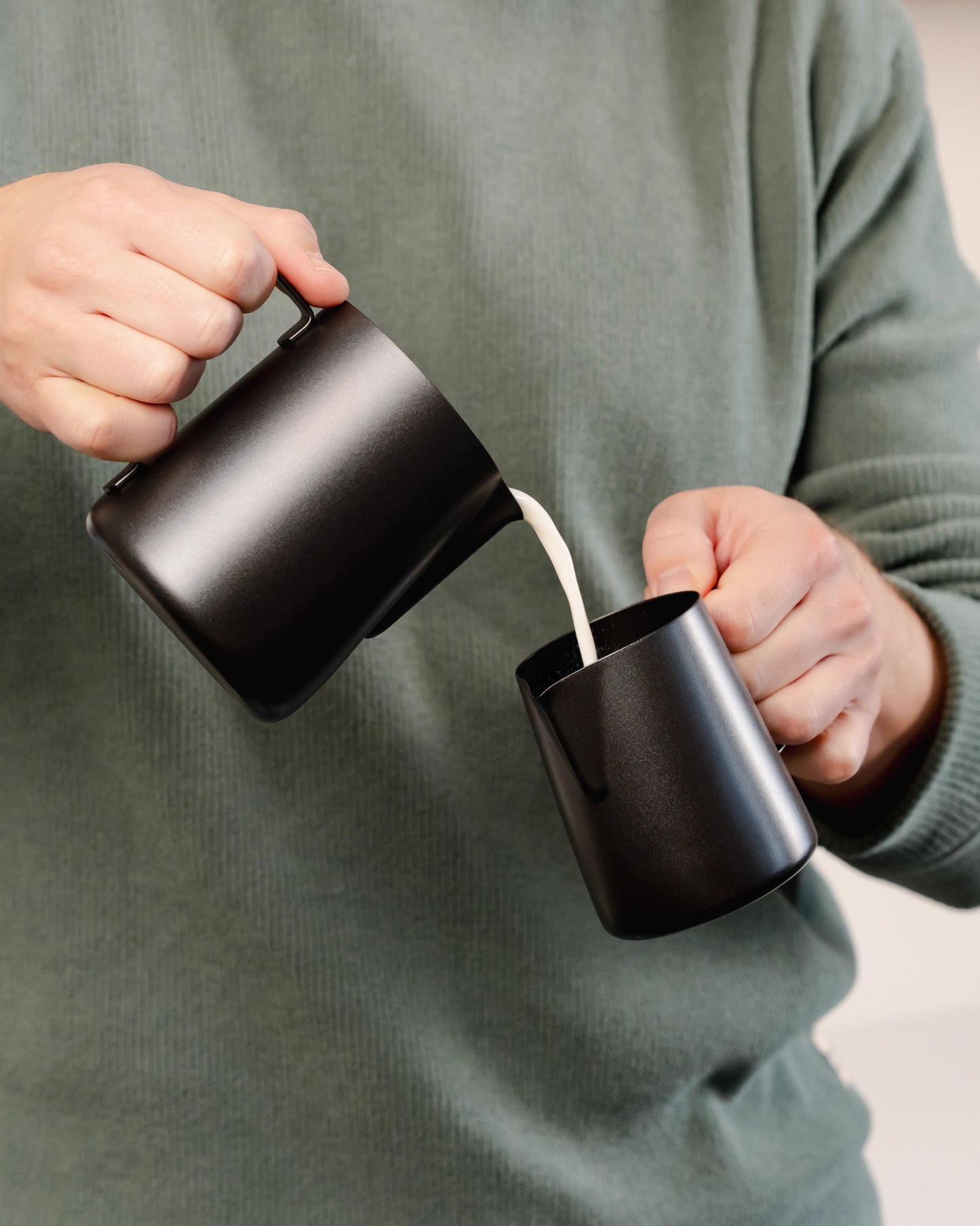Durch das Umfüllen der Milch zwischen den Kännchen verschwinden Luftblasen, und der Schaum wird seidig glatt.